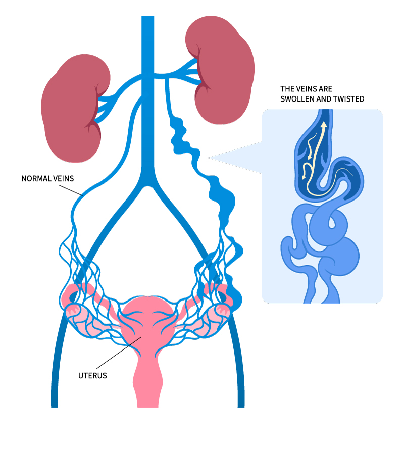 Just like varicose veins in the legs, pelvic veins can become weak or damaged, causing them to swell and hold too much blood. When this happens in the veins around the uterus, ovaries, or pelvis, it can cause discomfort and pain – especially after standing or sitting for long periods, during or after intercourse, or around menstruation.